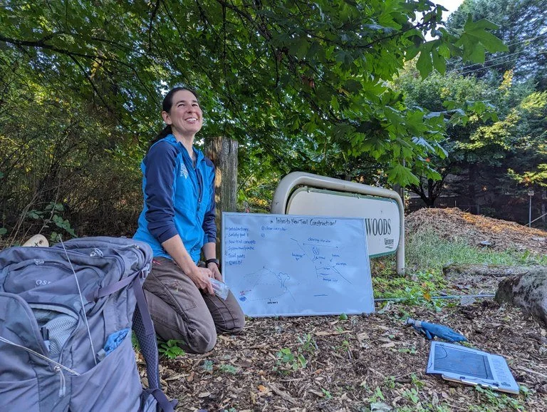 Stasia Honnold teaches new trail construction techniques to volunteers at Behrens Woods. The close-in location gave the crews more time to learn together. Photo by Varun Rathi.