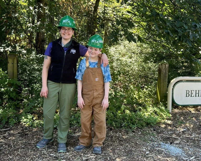 Rosemary remarked how meaningful it was to work on trail together as siblings. One memorable day at Behrens Woods, Rosemary earned her WTA vest (signifying her 25th work party) and Geoffrey received his own personalized green hat (celebrating his 5th work party). But the milestones weren’t all that made Behrens Woods special — the sibling duo also enjoyed seeing the progress made over time.