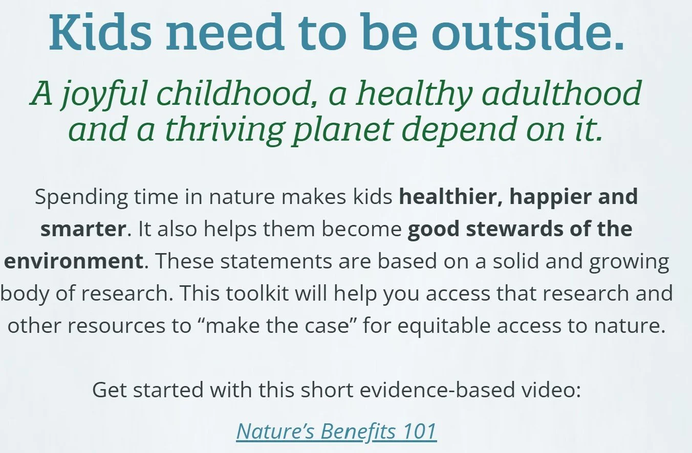 As national leaders and experts in collecting the data on children’s health, there is now lots of evidence that daily access to nature increases happiness, lowers stress & anxiety, improves academic performance and supports behavioral regulation for kids. Plus there are sooooo many fun things to do if the space and place to connect with nature is readily accessible. Learn more at their website: www.childrenandnature.org/the-benefits-of-nature/